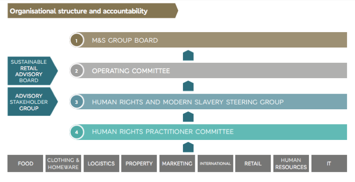 The structure that we’ve put in place helps us to address human rights across each of the different business units. A practitioner in each business unit is responsible for conducting a human rights risk assessment of their field of work, and for ensuring that effective due diligence measures are in place. Each identified practitioner is supported by a named director, and I oversee this combined human rights leadership team. The leadership team receive human rights training to inform their work streams, and are further supported by a Human Rights Steering Group, which includes representatives of key decision-makers across the business. The Steering Group remains small and agile enough to be able to debate tricky, difficult issues that M&S seeks to make progress on. I then provide regular human rights management updates to our Operations Committee, which is chaired by the CEO.